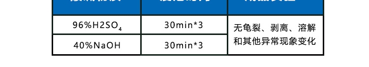 耐酸碱程度如下:在96%浓度的硫酸或者在浓度为40%的碱溶液中,浸泡30min,持续3次,产品表面无龟裂、无剥离、无溶解和其他异常现象变化;